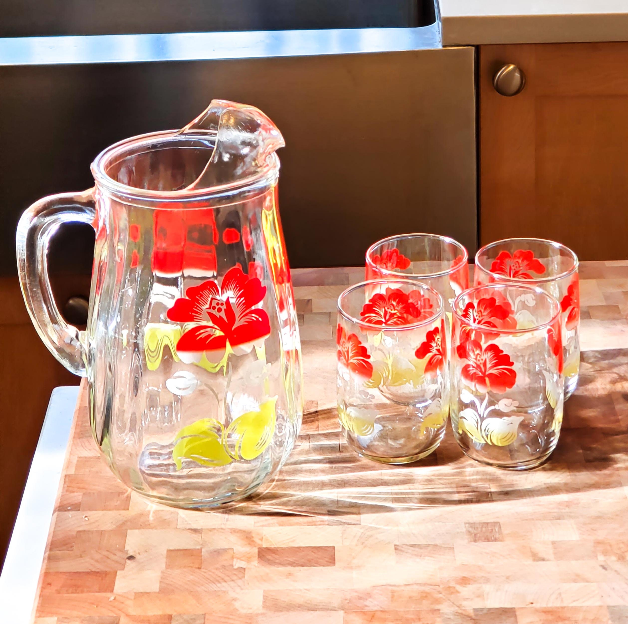 This is an adorable Glass juice pitcher with a motif of Red and Yellow Flowers. It is paired with 4 Matching juice glasses.